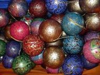 Wie kleine Kunstwerke wirken die Weihnachtskugeln aus Pappmaschee, die handlackiert und handbemalt aus dem nordindischen Kaschmir stammen. Dabei sind die Ornamente und Muster schon seit Jahrhunderten Bestandteil der muslimischen Kunst in Nordindien.