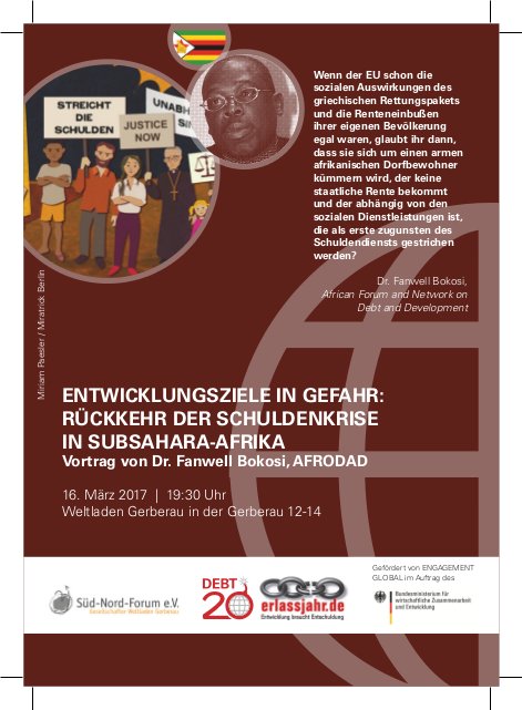 möchte das Entschuldungsbündnis erlassjahr.de kritisch verschuldeten Ländern Gehör verschaffen. Aus diesem Anlass ist Dr. Fanwell Bokosi vom African Forum and Network on Debt and Development in Deutschland.