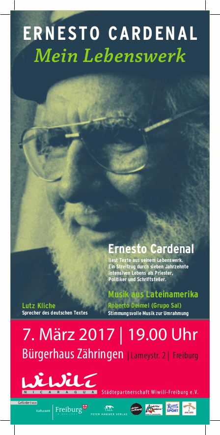 Lutz Kliche, Übersetzer und langjähriger Freund Ernesto Cardenals, wird die deutsche Übersetzung vortragen.