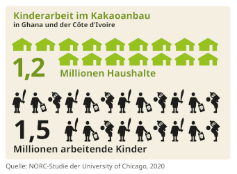 Seit Jahren versprechen die großen Schokoladenunternehmen, Armut und ausbeuterische Kinderarbeit im Kakaosektor zu beenden. Doch der Preis, den Kakaobäuer:innen in Ghana und der Elfenbeinküste für ihren Kakao erhalten, ist nicht existenzsichernd. Pro Euro, den eine Tafel Schokolade bei uns kostet, erhalten die Produzent:innen aktuell gerade einmal acht Cent. Dieser Betrag ist viel zu niedrig, um davon leben zu können. Während alle anderen Akteure in der Schokoladen-Lieferkette Gewinne erzielen, können die meisten Kakaobäuer:innen die Kosten für Produktion und Lebensunterhalt nicht decken. Daher arbeiten noch immer gut 1,5 Millionen Kinder unter ausbeuterischen Bedingungen auf den Kakaoplantagen. Der Hauptgrund hierfür ist Armut.