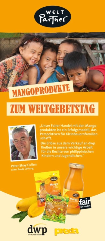 "Was ist den fair?" fragt das Motto des diesjährigen Weltgebetstags und stellt das Leben der Menschen auf den Philippinen in den Mittelpunkt. Am 03. März 2017 feiern Frauen in der ganzen Welt den Weltgebetstag und richten ihren Blick dabei auf die Inselwelt der Philippinen. DWP bietet anlässlich des Weltgebetstags eine Reihe an attraktiven Produkten ihrer philippinischen Partner an. Zum Beispiel leckere Mangoprodukte von der philippinischen Kinderschutz- und Fairhandelsorganisation Preda. Diese finden Sie auch bei uns im Weltladen.