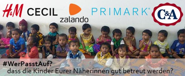 Wer passt auf die Kinder von Arbeiterinnen auf, während sie unsere Kleidung nähen? Und wer passt eigentlich darauf auf, dass Unternehmen ihre Sorgfaltspflicht wahrnehmen und Gesetze einhalten? FEMNET e.V. setzt sich mit der Kampagne #WerPasstAuf? dafür ein, dass Unternehmen ihrer sozialen Verantwortung nachkommen. Zusammen mit unseren Partnern in Indien und Bangladesch kämpfen wir u.a. dafür, dass Modeunternehmen gemeinsam mit ihren Zulieferern gute Kinderbetreuung für die Arbeiterinnen vor Ort einrichten und dass die Rechte schwangerer Arbeiterinnen beachtet werden, sodass die Gesundheit von Müttern und Kindern nicht gefährdet wird.