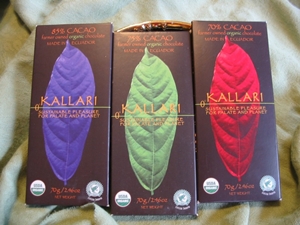 Zum einen gibt es die Kallari-Reihe, reine Zartbitterschokoladen mit unterschiedlichem Kakaogehalt, die zu 100% aus Bio-zertifizierten Zutaten bestehen. Wir haben alle drei Sorten im Sortiment.