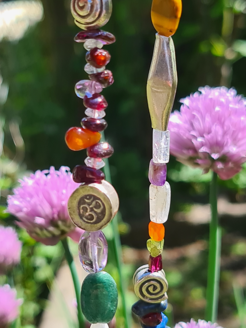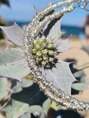 Die Silberelemente werden mit vielen Schmucksteinen und Kokosnusselementen kombiniert. Der Schmuck ist sehr reißfest, er wird auf siebenpoligem Stahldraht von hoher Qualität aufgezogen.