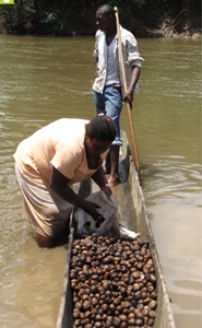 Die Taguapalmen werden nicht kultiviert, sondern wachsen in unwegsamen Regenwaldgebieten. Nach 20 Jahren trägt die Palme erste Fruchtstände, die bis zu 12 kg schwer werden können. Diese fallen nach 6-12 Monaten Reifung ab und werden dann vom Boden aufgesammelt. Die Fruchtstände haben eine stachelige Außenschale und sind in Kammern gegliedert, in welchen sich die einzelnen Nüsse befinden. Die Nüsse werden aus dem stacheligen Kolben geklopft und ausgehoben. Mit Booten erfolgt der Transport durch die unwegsame Region. Eine Palme kann bis zu 2000 kg Taguanüsse tragen!