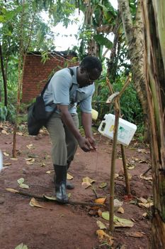 - Die Familien werden dabei unterstützt verbesserte Latrinen zu bauen (viele Familien haben gar keine Toilette und nutzen die Bananenplantage, somit werden Würmer und andere Erkrankungen übertragen). Des Weiteren unterstützt das Dorfgesundheitsteam den Bau von Tipi-Tap-Handwaschern (einfache Kanister, die mit Fußbetrieb Handwaschwasser liefern) und von Geschirr-Abtropfgestellen, und rät zur Teilnahme an Impfaktionen um Krankheiten zu verhüten u.v.m.